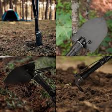 UBloqueo de mango único y diseño de cabezal de pala con cambio instantáneo - esta pala tiene barras de extensión y bloqueo de mango, por lo que la longitud del mango es ajustable según sus necesidades y no hay necesidad de preocuparse de que el mango se suelte. El cabezal de la pala tiene un botón de cambio instantáneo que permite cambiar el ángulo del cabezal de la pala rápidamente. También cuenta con una pala normal que ni siquiera tiene: sierra, abridor de botellas, azada, gancho, martillo de seguridad, silbato, cortador de cinturón